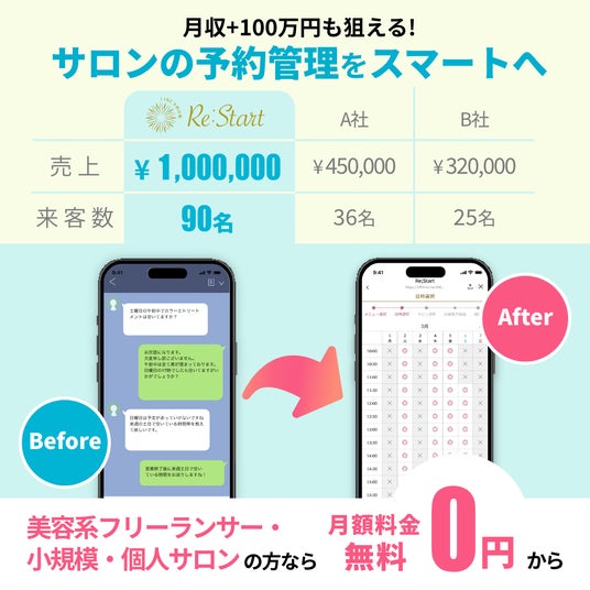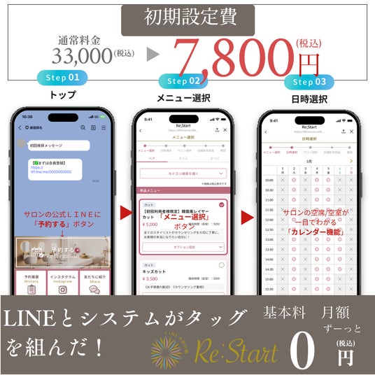 リスタートでは、空席/空室のカレンダー予約システム以外にも前日リマインドメッセージ機能、電子カルテ機能、売上管理データ、店販商品販促ツール、自店以外のシェアサロン登録/利用などさまざまなサービス提供が月額基本料が0円でご利用頂けます。