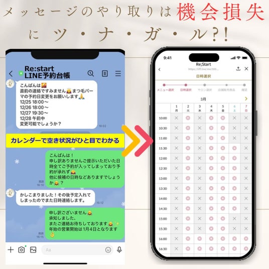 お客様が抱えるストレスはサロンの空席/空室状況がサロンへ問合せしないとわからないという事です。サロンの空席/空室状況がカレンダーから一目でわかるだけで、お客様のストレス軽減につながり、リスタートを導入したサロンは施術だけに集中できることで、毎月の売上拡大につながります。お客様は自身のLINE画面から操作でき10秒~15秒で予約が確定できるので、いままでのやり取り時間の短縮できるのでお客様の顧客満足度向上にもつながります。また前日にはお客様と施術者にも通知が届くので、予約忘れ防止としてもご活用頂けます。
