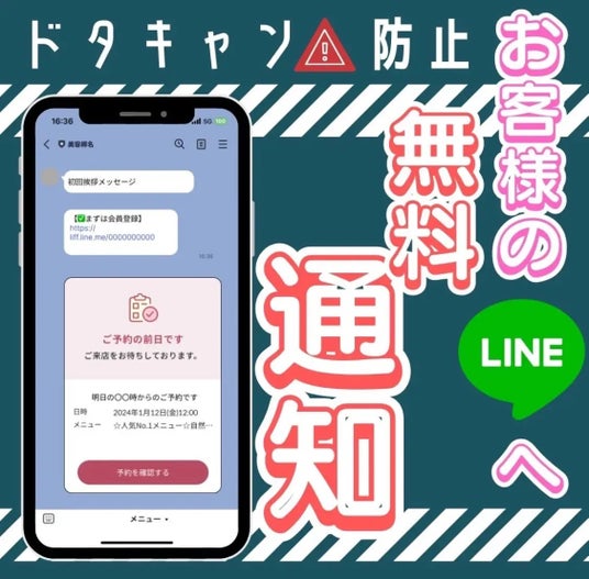 前日来店日告知メッセージ機能・お客様のLINEへ予約日の前日に「ご予約の前日」メッセージが無料で送信されます。お客様の予約忘れや、ドタキャン防止につながります。