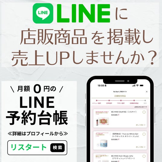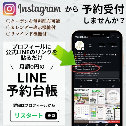 Instagramからも予約受付機能・Instagramのプロフィールに「サロン公式LINEURLリンク」を貼る事で、リスタートと連動して予約を承る事ができます。毎月の広告費をかけずに新規のお客様を獲得することが可能です。