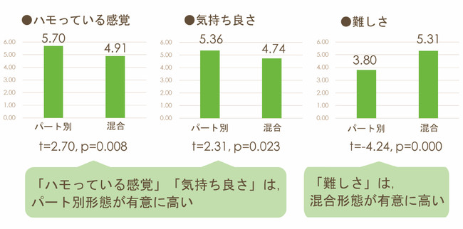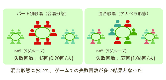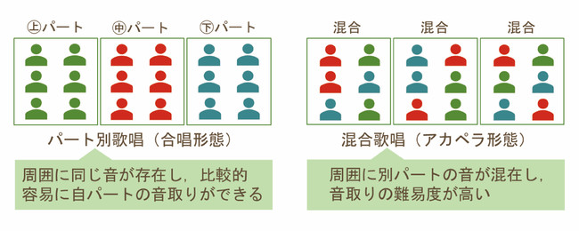パートごとに集まって歌う「パート別歌唱(合唱形態)」と複数パートが混ざって歌う「混合歌唱(アカペラ形態)」とを比較。