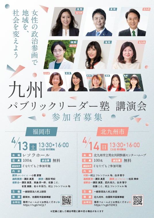 この「地方版パブリックリーダー塾」最初の取り組みとして、「九州パブリックリーダー塾」を発足いたします。2024年4月13日(土)に福岡市、4月14日(日)に北九州市にて「女性の政治参画で地域を、社会を変えよう」と題した講演会を開催いたします。ぜひご取材賜りますようお願い申し上げます。