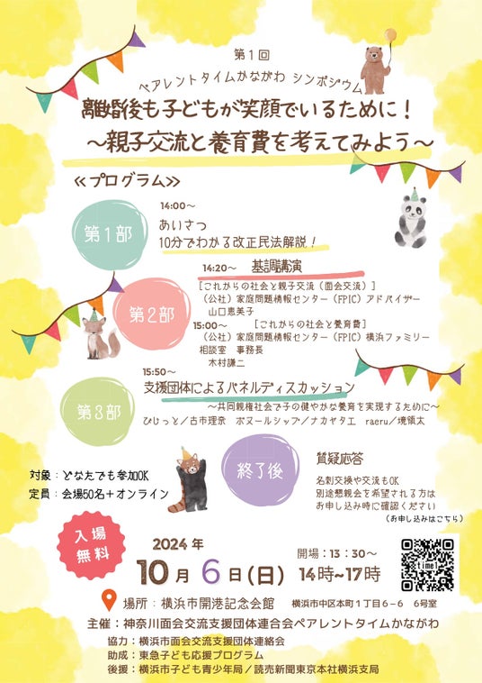 この度、ペアレントタイムかながわは、「第1回 ペアレントタイムかながわシンポジウム」を10月6日(日)に開催いたします。当日は、家庭問題情報センター(FPIC)の基調講演や、びじっとをはじめ神奈川県を代表とする支援団体によるパネルディスカッションを行い、離婚後も子どもが笑顔でいるための親子交流と養育費について考える場を提供いたします。