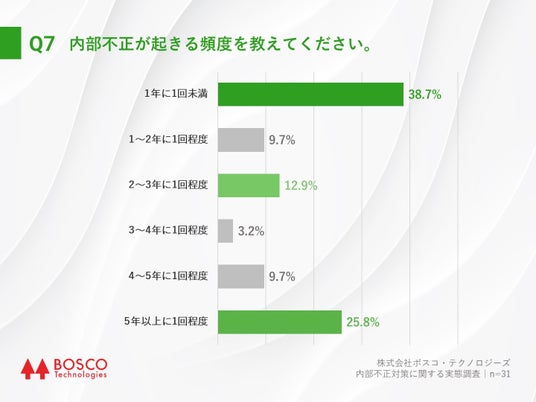 Q1で「何度もある」「数回程度ある」と回答した方に、「Q7.内部不正が起きる頻度を教えてください。」(n=31)と質問したところ、「1年に1回未満」が38.7%、「5年以上に1回程度」が25.8%、「2~3年に1回程度」が12.9%という回答となりました。