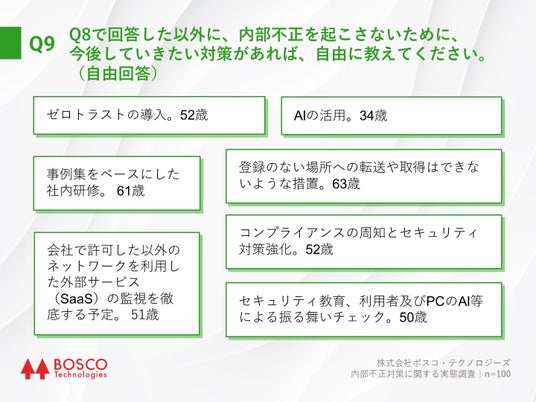 「Q9.Q8で回答した以外に、内部不正を起こさないために、今後していきたい対策があれば、自由に教えてください。(自由回答)」(n=100)と質問したところ、「ゼロトラストの導入」や「AIの活用」など100の回答を得ることができました。