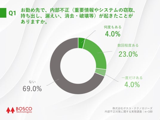 「Q1.お勤め先で、内部不正(重要情報やシステムの窃取、持ち出し、漏えい、消去・破壊等)が起きたことがありますか。」(n=100)と質問したところ、「何度もある」が4.0%、「数回程度ある」が23.0%、「一度だけある」が4.0%という回答となりました。