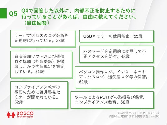 「Q5.Q4で回答した以外に、内部不正を防止するために行っていることがあれば、自由に教えてください。(自由回答)」(n=100)と質問したところ、「サーバアクセスのログ分析を定期的に行っている」や「USBメモリーの使用禁止」など100の回答を得ることができました。