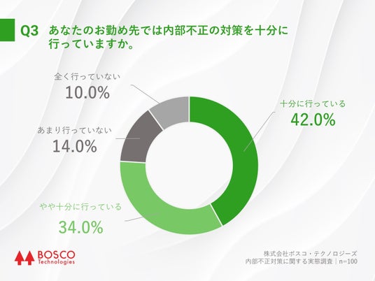 「Q3.あなたのお勤め先では内部不正の対策を十分に行っていますか。」(n=100)と質問したところ、「十分に行っている」が42.0%、「やや十分に行っている」が34.0%という回答となりました。