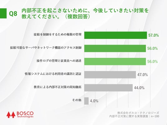 「Q8.内部不正を起こさないために、今後していきたい対策を教えてください。(複数回答)」(n=100)と質問したところ、「接続を制御をするための権限の管理」が57.0%、「接続可能なサーバやネットワーク機器のアクセス制御」が56.0%、「操作ログの管理と従業員への通達」が56.0%という回答となりました。