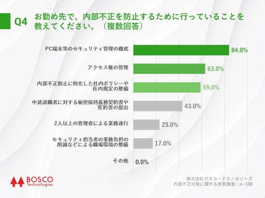 「Q4.お勤め先で、内部不正を防止するために行っていることを教えてください。(複数回答)」(n=100)と質問したところ、「PC端末等のセキュリティ管理の徹底」が84.0%