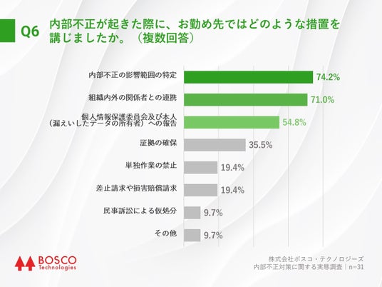 Q1で「何度もある」「数回程度ある」「一度だけある」と回答した方に、「Q6.内部不正が起きた際に、お勤め先ではどのような措置を講じましたか。(複数回答)」(n=31