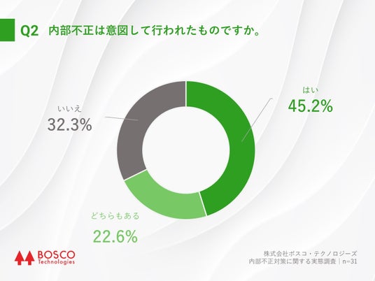 Q1で「何度もある」「数回程度ある」「一度だけある」と回答した方に、「Q2.内部不正は意図して行われたものですか。」(n=31)と質問したところ、「はい」が45.2%、「どちらもある」が22.6%という回答となりました。