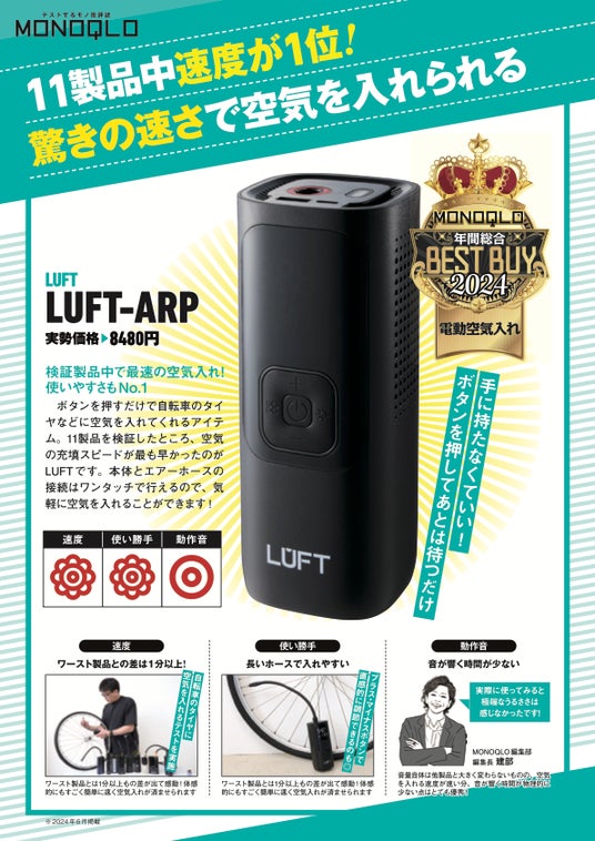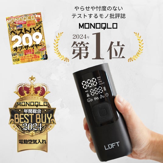 カー用品ブランド「LUFT ルフト」を運営する、株式会社アイデンティティー(本社:兵庫県尼崎市)は、2024年度の新モデル「LUFT 電動空気入れ LUFT-ARP」が、テストするモノ批評誌『MONOQLO』の2025年1月号で、ベストバイ・オブ・ザ・イヤー2024 電動空気入れ部門の「年間総合ベストバイ No.1」に選ばれました。