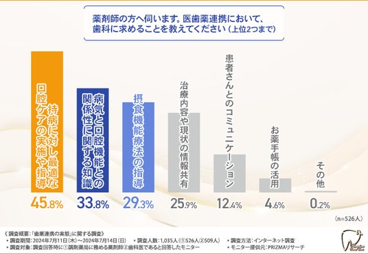 まず薬剤師の方へ「医歯薬連携において、歯科に求めることを教えてください(上位2つまで)」と質問したところ、『持病に対し最適な口腔ケアの実施や指導(45.8%)』『病気と口腔機能との関係性に関する知識(33.8%)』『摂食機能療法の指導(29.3%)』と回答しました。