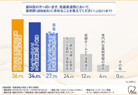 つぎに、歯科医の方へ「医歯薬連携において、薬剤師(調剤薬局)に求めることを教えてください(上位2つまで)」と質問したところ、『歯科治療に関連する薬剤の適正使用の指導(36.9%)』『患者への服薬指導とフォローアップ(34.8%)』『患者への処方薬の相互作用チェックとアドバイス(27.3%)』と回答しました。