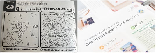 左:「地球温暖化クイズ」塗り絵・右:株式会社山櫻バナナペーパー解説書