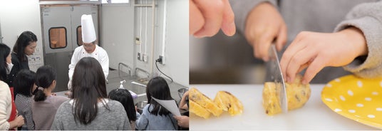 左:高島屋の厨房での体験の様子・右:実際にお子さんがスイーツを切っている様子