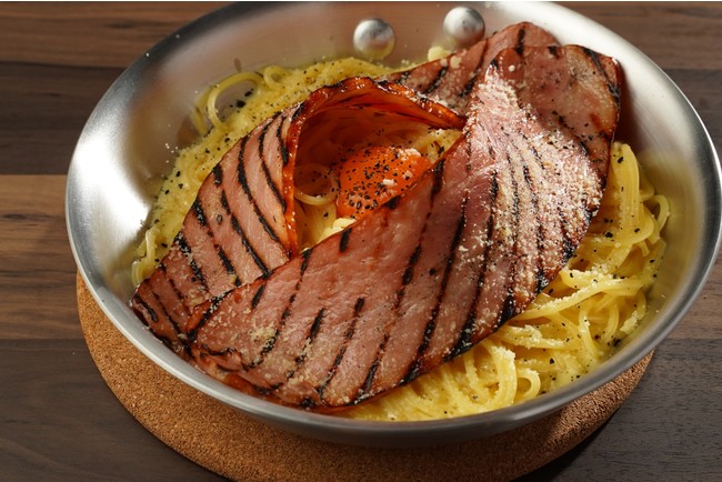 大判のベーコンをふんだんに使用し、豪快にかぶりついて食べるカルボナーラ