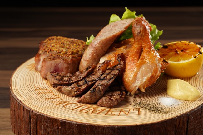 ロティサリーチキン、あらびきソーセージを贅沢に盛り合わせた名物肉盛り