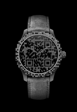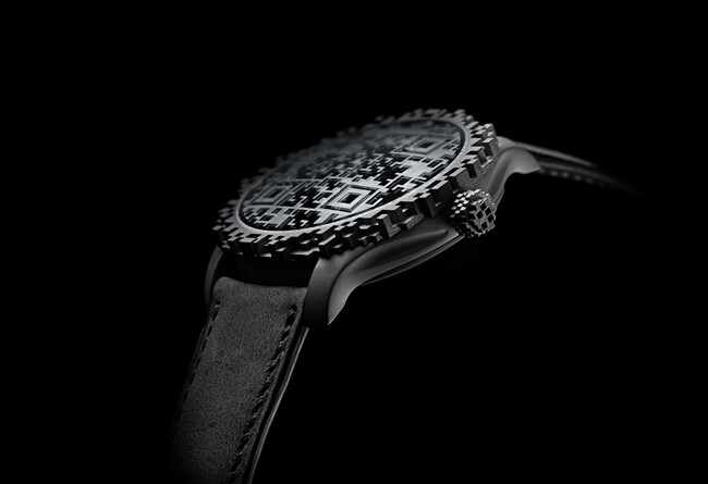 リファレンス 1200-1238、マイクロブラスト加工のステンレススチールモデル、 3D プリントによるチタン製リュウズおよびベゼル、Vantablack(R) ダイアル、サファイアガラスに QR コードのエングレービング、グレーのクーズーレザーストラップ、50 本限定