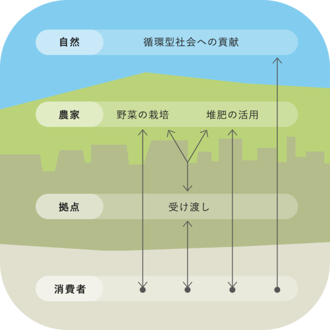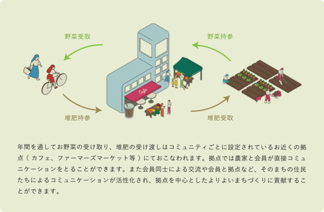 CSA LOOPではさらに、会員は家庭で使いきれない堆肥を農家へ預け、農家がそれを農業で使用できる品質へと仕上げていき、野菜を生産します。従来都市部で課題となってきた生ごみ削減によって出来上がる堆肥の有効活用方法の一つとして、農家と連携することで解決につなげ、持続可能な農業、持続的な循環を作り出していくことができます。その際、基本となる野菜の受け取りにはカフェやファーマーズマーケットを拠点とすることで、街のなかでの機能、場所としての機能を最大限に生かし、そのコミュニティの拠点として人の往来、野菜や堆肥のやりとりがおこなわれ、地域資源循環が生まれます。