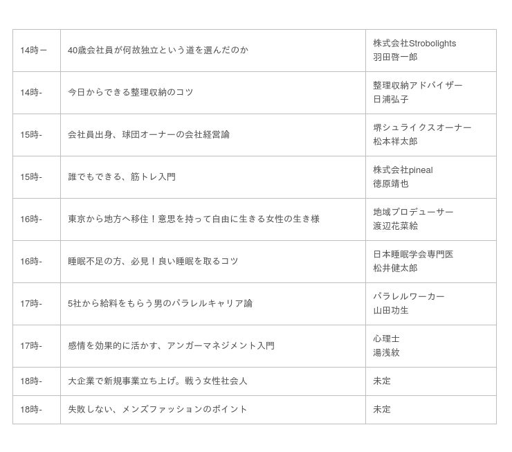 各講座は全てオンライン開催かつ無料で複数参加可能なため、自宅から手軽に講座を受講していただくことが出来ます。開始時刻とテーマ・登壇者(タイトルは変更可能性あり、一部登壇者未定のため最新情報は公式HPをご覧ください。)は以下の通りです。なお、同時刻に開催される講座はどちらか片方のみ参加可とさせていただきます。