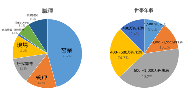 ・職種 営業:45.7% 管理:14.7% 研究開発:12.2% 現場:11.2%