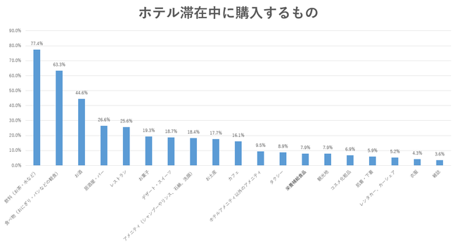 ホテル滞在中に購入・消費されやすいものは多い順に、飲料77%、食べ物63%、お酒45%、居酒屋・バー27%、レストラン26%、お菓子・デザート・スイーツ19%、アメニティ18%、お土産18%、カフェ16%となっており、高いリーセンシー効果が見込まれる。