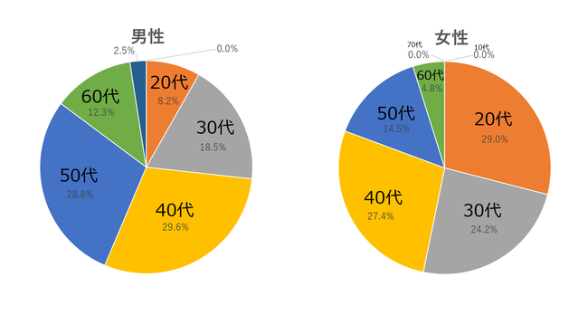 ・年代 男性のうち30~50代の割合が76.9%/女性のうち20~40代の割合が80.6%