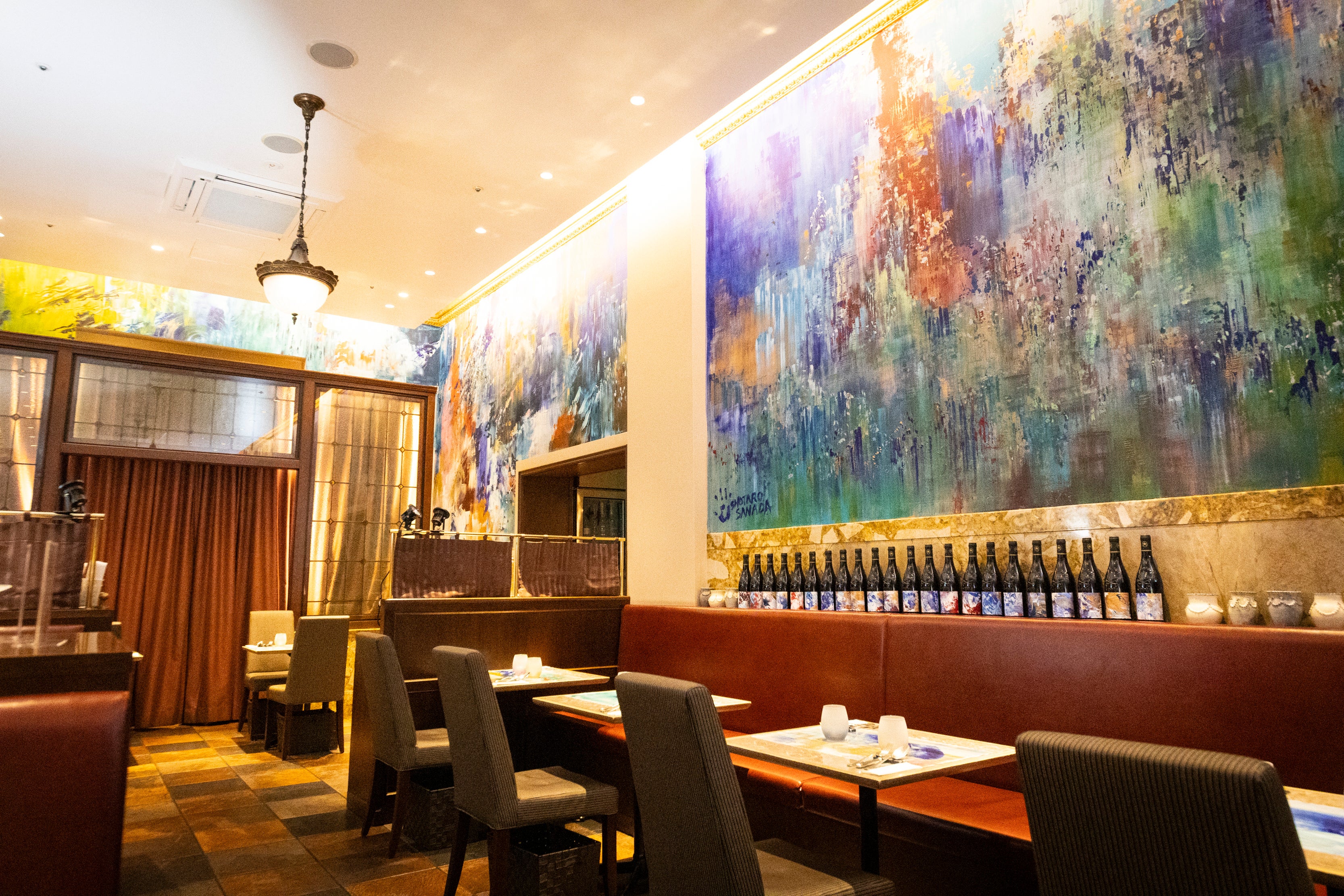 店内は、画家・真田将太朗の壁画に包まれたエリアと、戦前、皇族や政府要人が列車を待つために使われていた貴賓室を改装したエリアが共存しています。趣の異なるそれぞれの空間で、肩肘張らずにワインと食事を楽しめるのも、このレストランならではの魅力です。