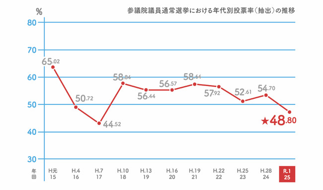 第26回参議院議員選挙が7月10日に実施が見込まれています。しかし、衆院選の投票率は昭和55年をピークに右肩下がりで、前回の参院選(令和1年実施)では過去2番目に低い投票率48.80%を記録しました。