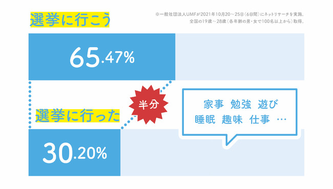 当団体では投票率低下の原因を探るべく、2021年10月に全国の19歳~28歳(各年齢の男・女で100名以上)の方に政治意識に関するネットリサーチを実施しました。その中で「Q.あなたは今回の総選挙で投票に行きますか?」という問いに対して「投票する」・「おそらく投票する」と答えた方の割合は65.47%でした。それに対して、同年代の衆院選での投票率は30.20%でした。
