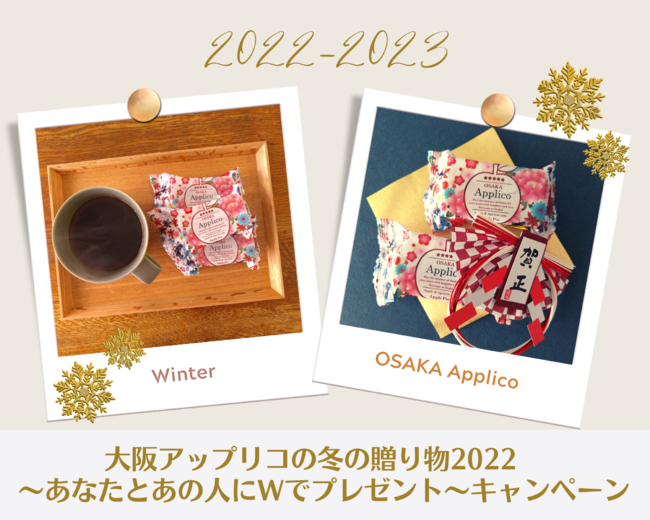 大阪から発信するアップルパイ『OSAKA Applico(大阪アップリコ)』を製造販売する株式会社太陽スイーツフィールド・太陽食品株式会社は、『大阪アップリコの冬の贈り物2022 ~あなたとあの人にWでプレゼント~』と題して、Instagram及びTwitter上で大切な人へ贈り物をしたい想いを発信頂く冬のキャンペーンを合同で実施いたします。当選者の方には「Amazonギフトカード1万円分+贈る事が出来るOSAKA Applico(大阪アップリコ)10個入りと5個入り」の2種類がダブルで5名様など、総勢55名様にプレゼントが当たります。