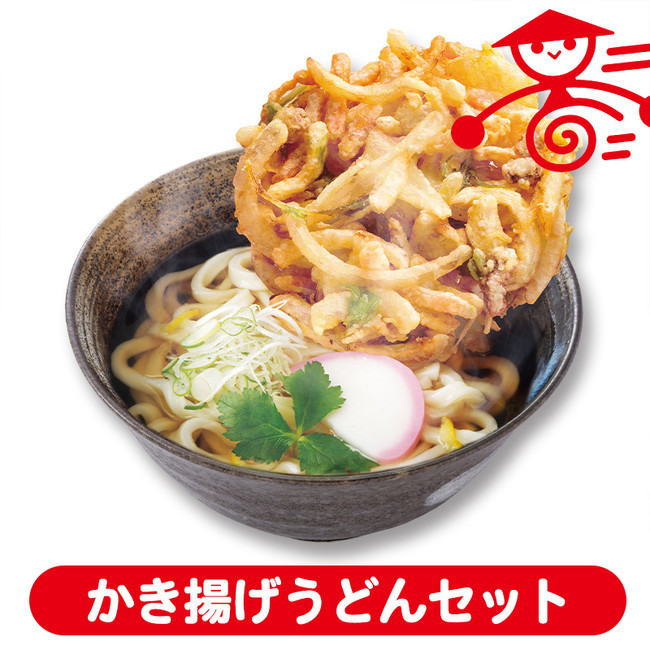 大きなかき揚げが自慢のかき揚げうどんセット。かき揚げはレンジで温めるだけで揚げる必要はありません。いつでもすぐにお召し上がりいただけます。