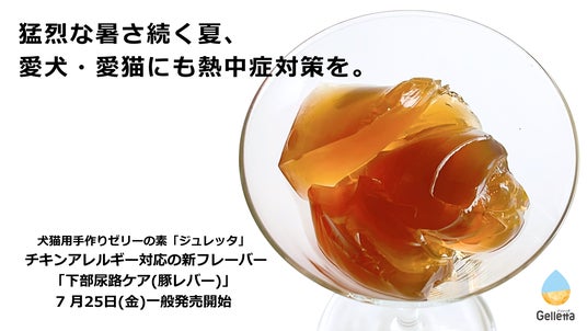 犬猫用手作りゼリーの素「Gelletta (ジュレッタ)」等を開発・製造・販売する合同会社Wisham(よみ:ウィシャム、所在地:東京都千代田区、代表:鈴木 綾子、以下:当社)は、2025年7月25日(金)より、チキンアレルギーを持つ犬猫向けの新フレーバー「下部尿路ケア(豚レバー)」の一般発売を公式オンラインストアで開始します。「下部尿路ケア(豚レバー)」は、既存の「Gelletta」シリーズにさらに機能性を加えた、より予防医学に着目したプロダクトシリーズ「Gelletta Plus+(ジュレッタプラス)」の第二弾です。今後当社は「Gelletta Plus+」の動物病院向け販売に力を入れてまいります。また、7月は犬猫の熱中症の診療件数が1年で最も多い月(※1)であることから、この時期に新発売することで愛犬・愛猫の水分補給を意識してもらうことも狙いとしています。