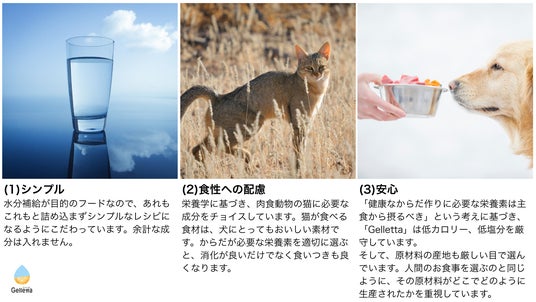 「Gelletta」は、犬猫の水分補給に特化した“食べるお水”。水分不足が原因で発症するリスクの高い下部尿路疾患などの予防を主な目的とした新しい食習慣として、2020年に発売されました。お湯に溶かして冷やすだけで簡単に作れることから「愛犬・愛猫のために手軽に始める健康習慣の一つ」として、特に尿石症や膀胱炎などの症状が再発しやすい犬猫オーナーさまに喜ばれてきました。