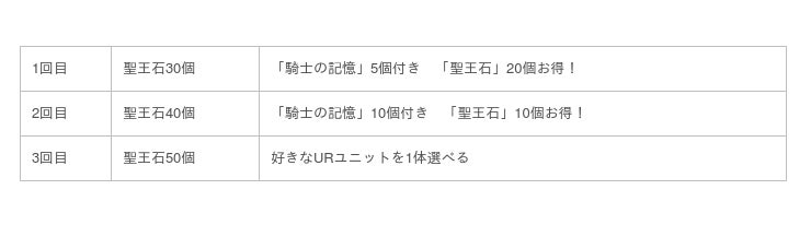 通常1回あたり「聖王石」50個が必要な「10連ガチャ」を、初回は「聖王石」30個で、2回目は40個で1回まわすことができ、それぞれ「騎士の記憶」がおまけで付きます。