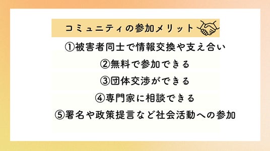 被害に遭われた方はお辛い心境かと思います。一人で抱え込まず辛い心境は支え合い、ぜひ匿名で構いませんのでお気軽にコミュニティに参加してください。また被害を見かけた方の声もお待ちしております。あなたの声が未来の起業しやすい環境を作ります。ぜひ一緒に問題の解決に向けて力を合わせていきましょう。