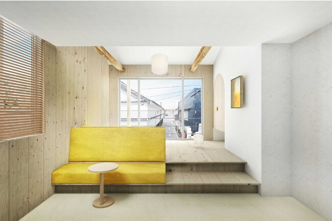 2階のコンセプトは『豊かなミニマルな暮らし』です。商店街に暮らすような体験を目指して、小上がりや天井で高低差をつくって、寝るだけでなく、働いたり、リラックスしたりして滞在できるようにゾーニングを分けて計画し、デスクやソファを置いて、小さいながらも奥行きのある空間としました。客室には、西粟倉村・森の学校と提携した杉材と、地元由来である瀬戸田漆喰で仕上げました。