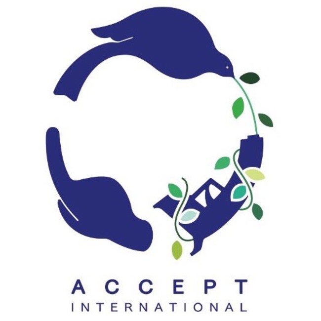人の指から鳩を放ち、銃をツタに絡め封じている、アクセプト・インターナショナルのロゴには、「人権的な手法で暴力を機能停止させる」という意味を込めています。葉の多様な彩りは多様性を意味し、寛大や再生を表しています。
