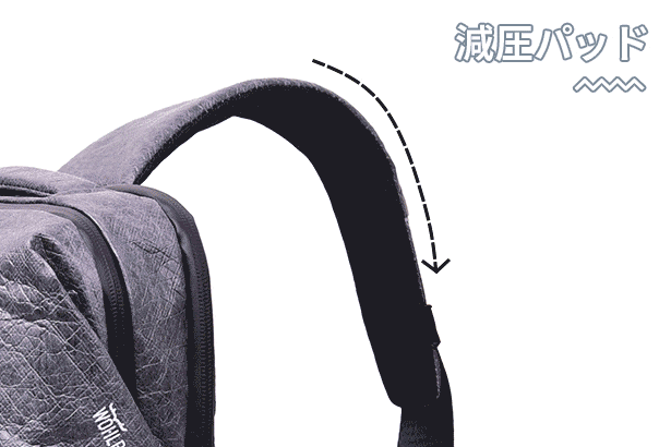 ショルダーバッグはショルダー部分に発泡ポリエチレンを使用した減圧パッドを付け、圧迫感を緩和しています。