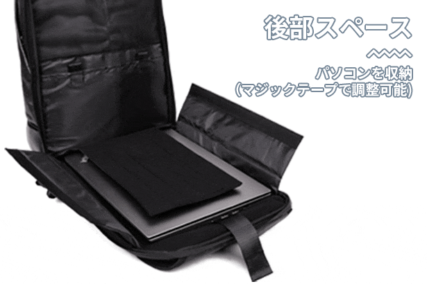 内部のスペースは前部に身の回りの物を、後部にパソコンを収納できるように分かれており、必要な物をサッと取り出すことができます。