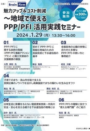 株式会社ブレインファーム(本社:東京都港区 代表取締役 新谷聡美)は、このたび、地域のまちづくりのための解決策である官民連携(PPP/PFI)について、具体的な知識と事例を解説し、はじめてPPPに取組む自治体や地方企業にも役立つ無料セミナーをオンラインで開催することが決まりましたのでお知らせします。