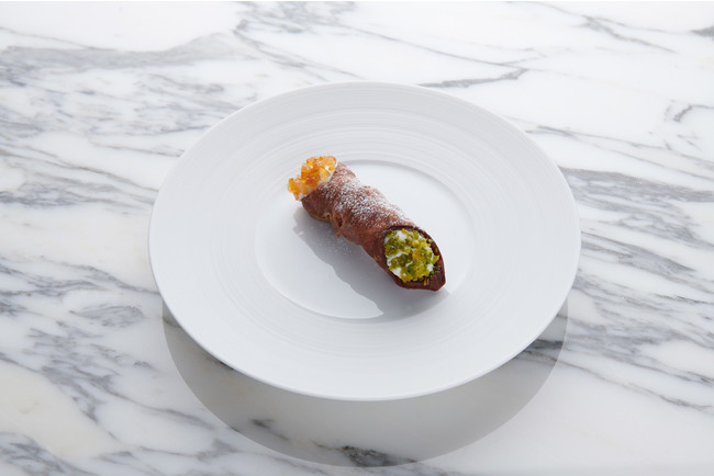 生地の内側にKAOKA50 %のチョコレートをコーディングしフレッシュなリコッタチーズのクリームを絞り、両サイドにKAOKA50%のチョコチップをトッピング、カンノーロの生地の内側にガーナ産70%のチョコレートをコーディングし、ガーナさん70%のチョコレートを混ぜ合わせたリコッタクリームを絞り、両サイドにオレンジピールとピスタチオをトッピング