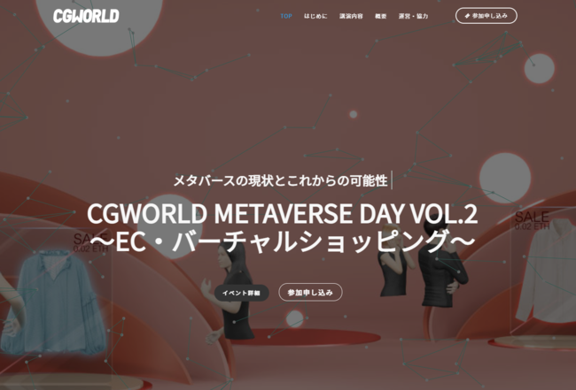 「CGWORLD METAVERSE DAY」はクリエイターの目線からメタバースの活用、新たなコンテンツ制作の方法を探るオンラインイベントです。Vol.2ではEC・バーチャルショッピングにフォーカスを当て、メタバースをビジネスにどう活用できるか?やあらたな体験設計とデザイン、アセットの制作に関してご紹介いたします。