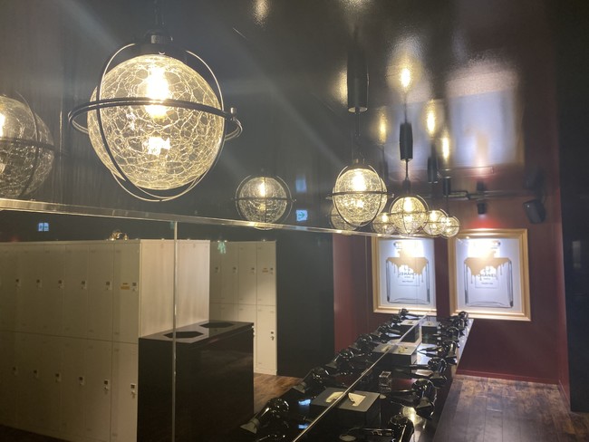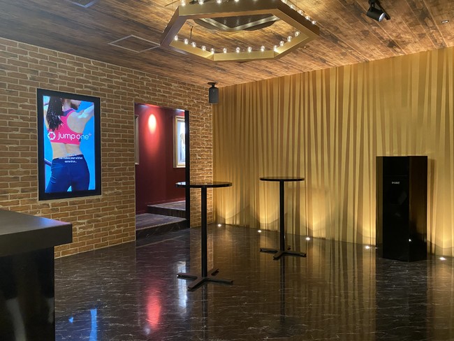「jump one 田町」のフロントは、従来のフィットネスのイメージを覆す、まるで「劇場に足を踏み入れたかのような空間」に仕上がっております。また、フロントの雰囲気とはガラッと変わり、スタジオ内は全長約8mの巨大スクリーンを設置し、近未来的な空間に。スクリーンに映し出される映像は、レッスン中の音楽や照明、インストラクターの動きと連動し、まるで音楽フェスやライブに来ているかのような、圧倒的な臨場感をご体験いただけます。