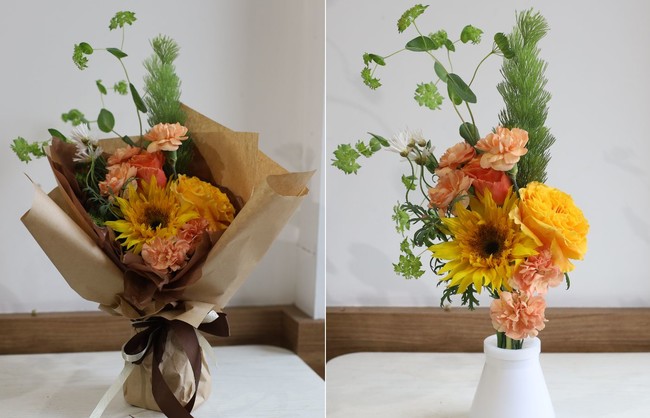 ラッピング(写真左)を取ると、中に割れない花瓶(写真右)が入っており、花瓶がないご家庭でもそのまま置いて飾れる商品になっております。記念日やお祝いのプレゼントにぴったりのブーケです。