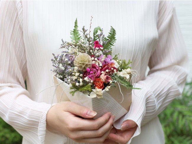 家で花を飾りたいけど、花瓶がない、スペースがない方でも、手のひらサイズのカップブーケなら机、ダイニングテーブル、玄関、場所を選ばず簡単にお部屋を彩ることができます。7日から10日ほどお日持ちいたします。枯れてしまってもそのまま放置していただければ2週間ほどでドライフラワーになります。