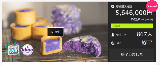 コロナ禍でハワイに行きたくてもなか なか行けない辛い状況が続く中、このスイーツの応援をすることで、ハワイを応 援できる、日本でもハワイを楽しめる、 との期待感となりMakuakeのクラウドファンディングで867名からの支援を受け、目標売上1882%を達成し、日本初上 陸を果たした【UBAE】。