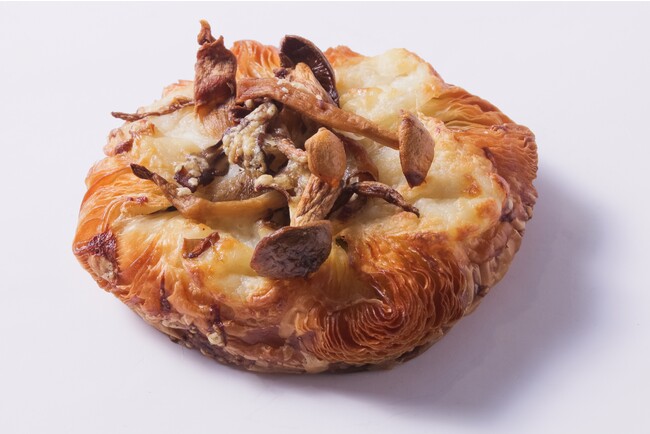 5種類のキノコをふんだんに使用した秋の一品。サクサクのクロワッサン生地にひらたけ、エリンギで作ったデュクセルを包み込み、マイタケ、ブナシメジ、ブナピーを上にのせて焼き上げました。